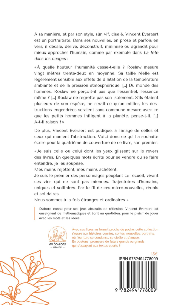 « Je suis celle ou celui dont les yeux glissent sur le revers des livres. En quelques mots écrits pour se vendre ou se faire entendre, je les soupèse. Mes mains rejettent, mes mains achètent. Je suis le premier des personnages peuplant ce recueil, vivant ces vies qui ne sont pas miennes. Trajectoires d’humains, uniques et solitaires. Par le fil de ces micro-nouvelles, réunis et solidaires. Nous sommes à la fois étranges et ordinaires. »